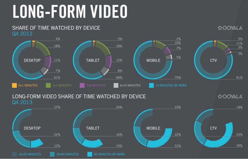 再深入分析数据,移动设备观众正在观看更多的长篇内容,Ooyala强调: